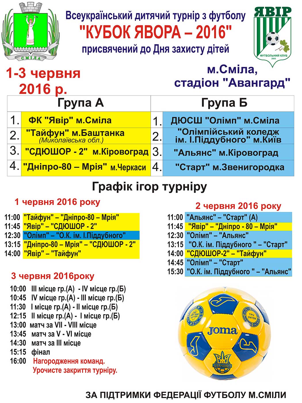 Графік ігор Всеукраїнського дитячого турніру з футболу присвяченого Дню захисту дітей що пройде 1-3 червня в м. Сміла | |